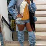 - Crew Neckline, Denim Long Sleeves, Slit Front