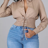 - Spread Collar, Long Sleeves, Button Front, Lace Up